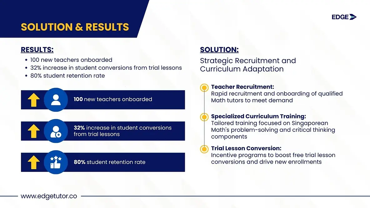 Understanding the unique demands of the Singaporean Math curriculum, EDGE Tutor worked closely with the client to develop a rigorous math tutor training program that prepared teachers to deliver the curriculum’s problem-solving and critical thinking components. From recruitment to onboarding, teachers underwent focused training sessions that ensured they were fully equipped to meet both the curriculum’s rigorous standards and the client’s expectations for lesson consistency and reliability.